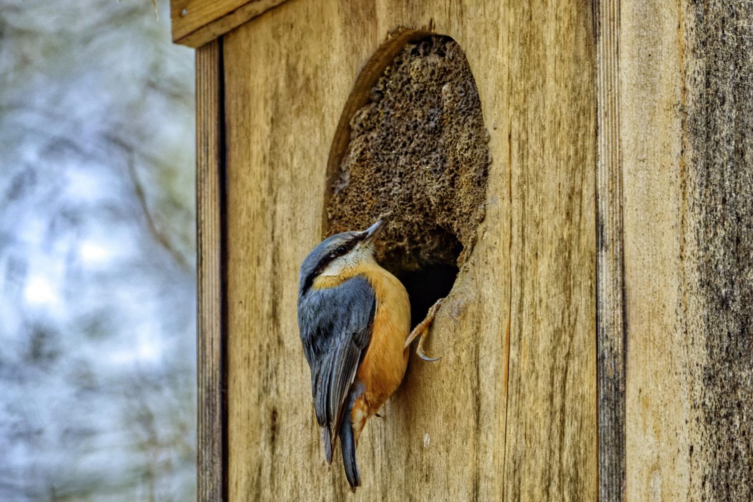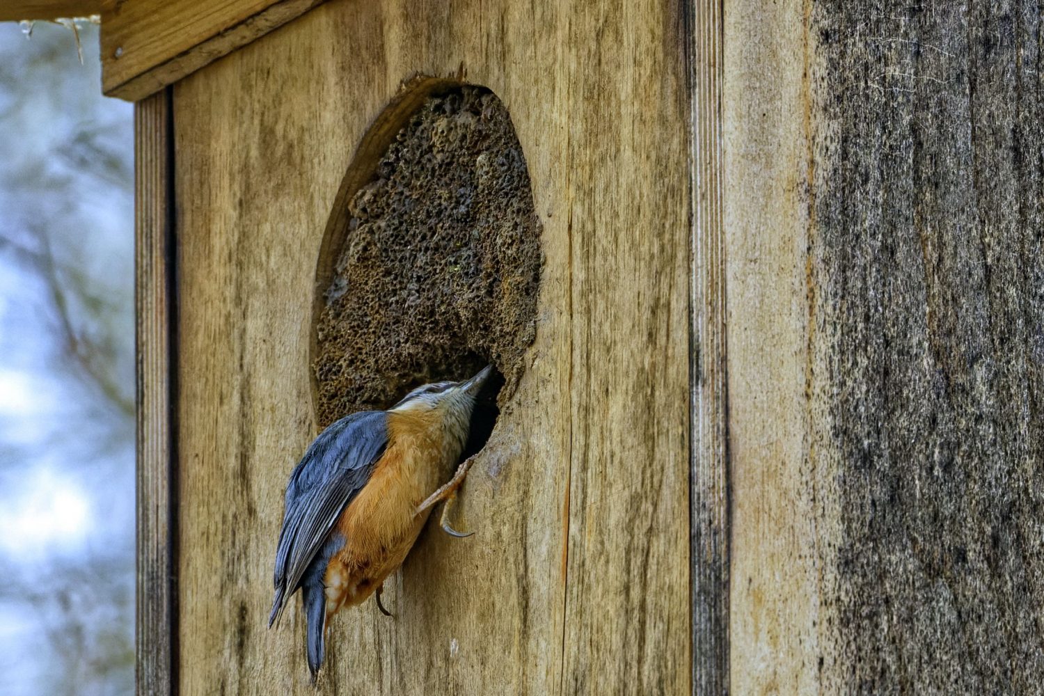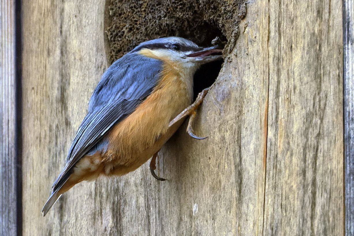 Ein Kleiber verkleinert den Eingang vom Kauzkasten am Schniggenteich.