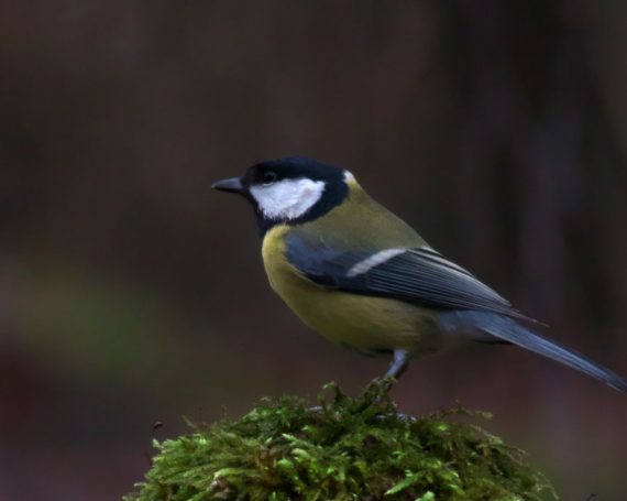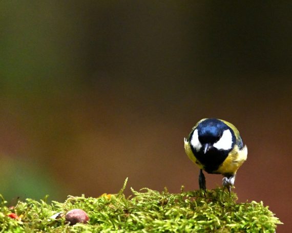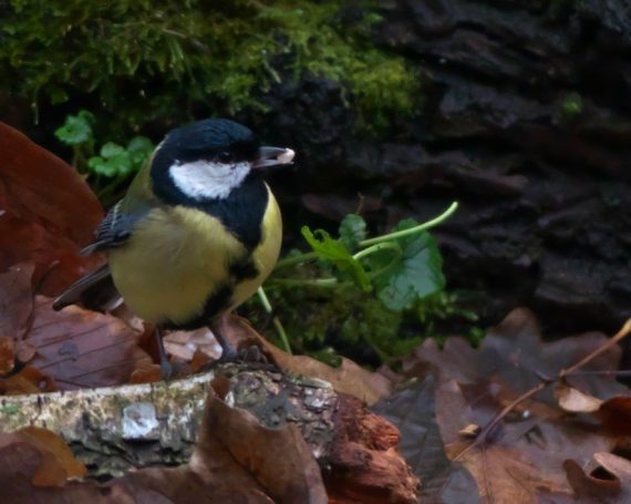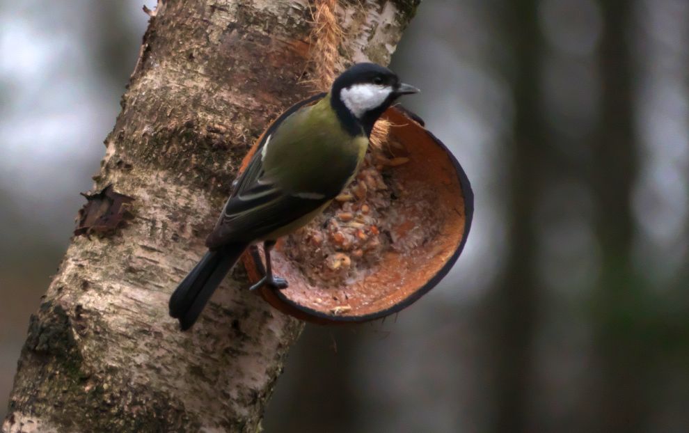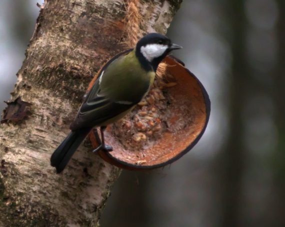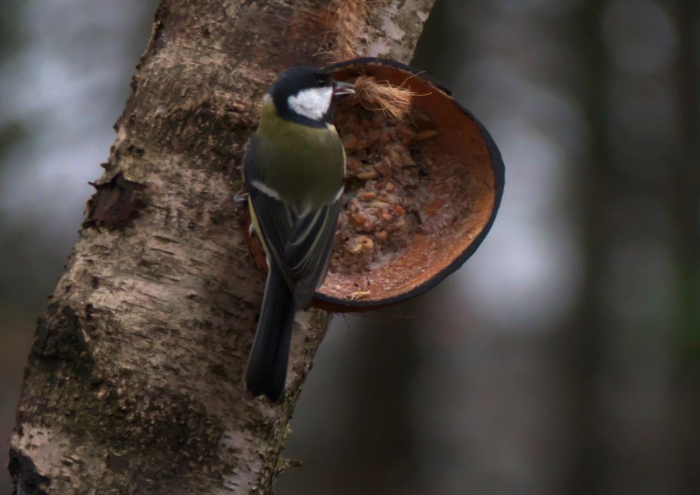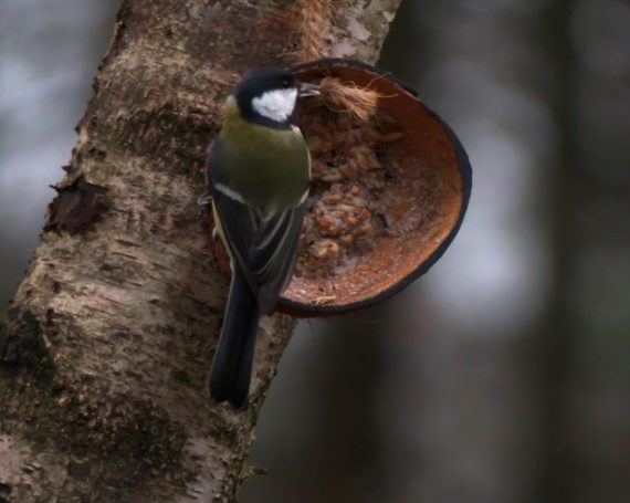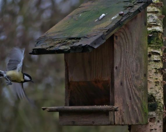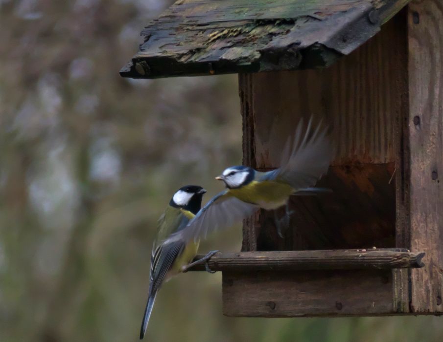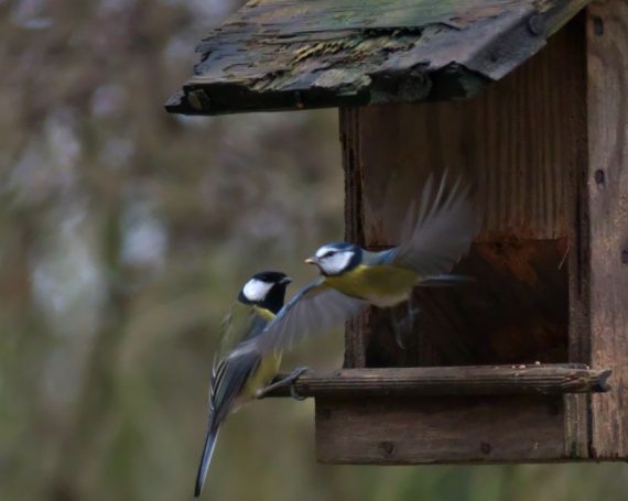 Blaumeise im Abflug + Kohlmeise im Wartestand; Kohlmeise im Anflug, Kohlmeise mit Erdnuss – an Hütte im ehemaligen Schulgarten