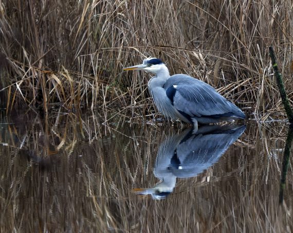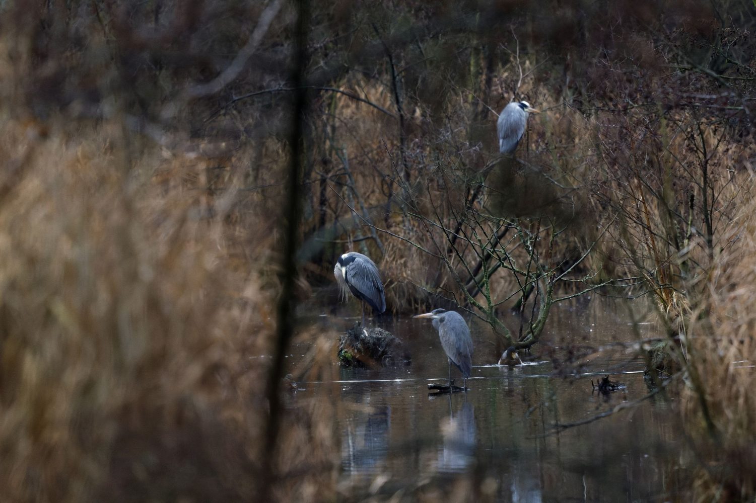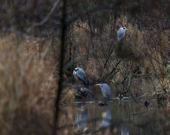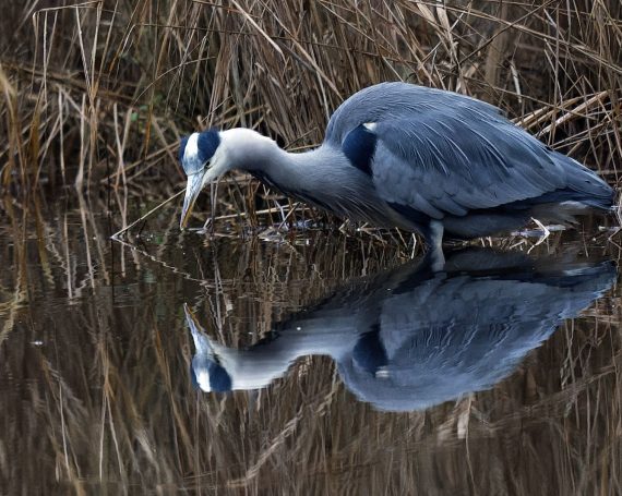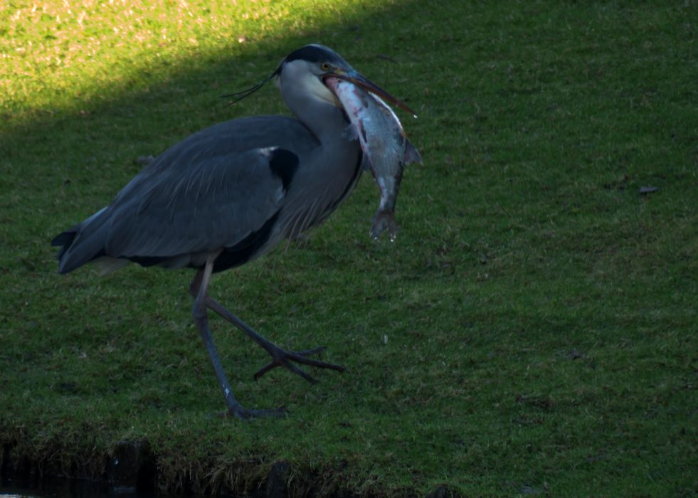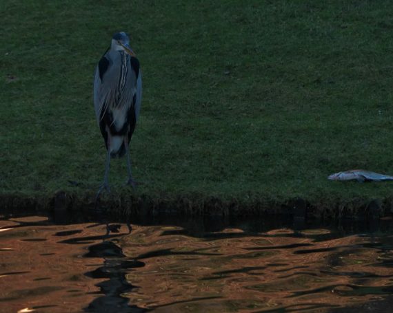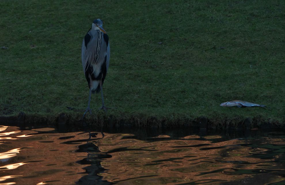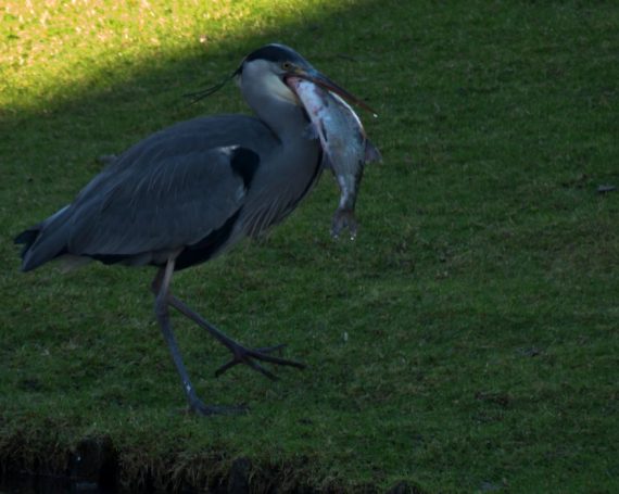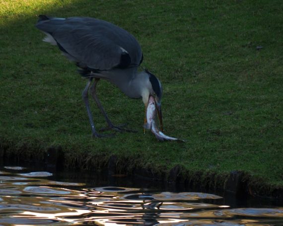 Am 1. Weihnachtstag erwischte ein Graureiher am Schloss Gemen einen wohl zu großen Fisch, den er wieder ablegte. Danach suchte er nach kleinerer Beute.