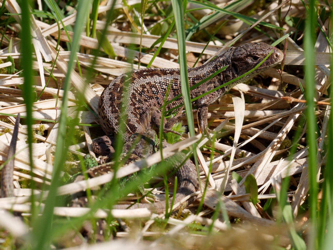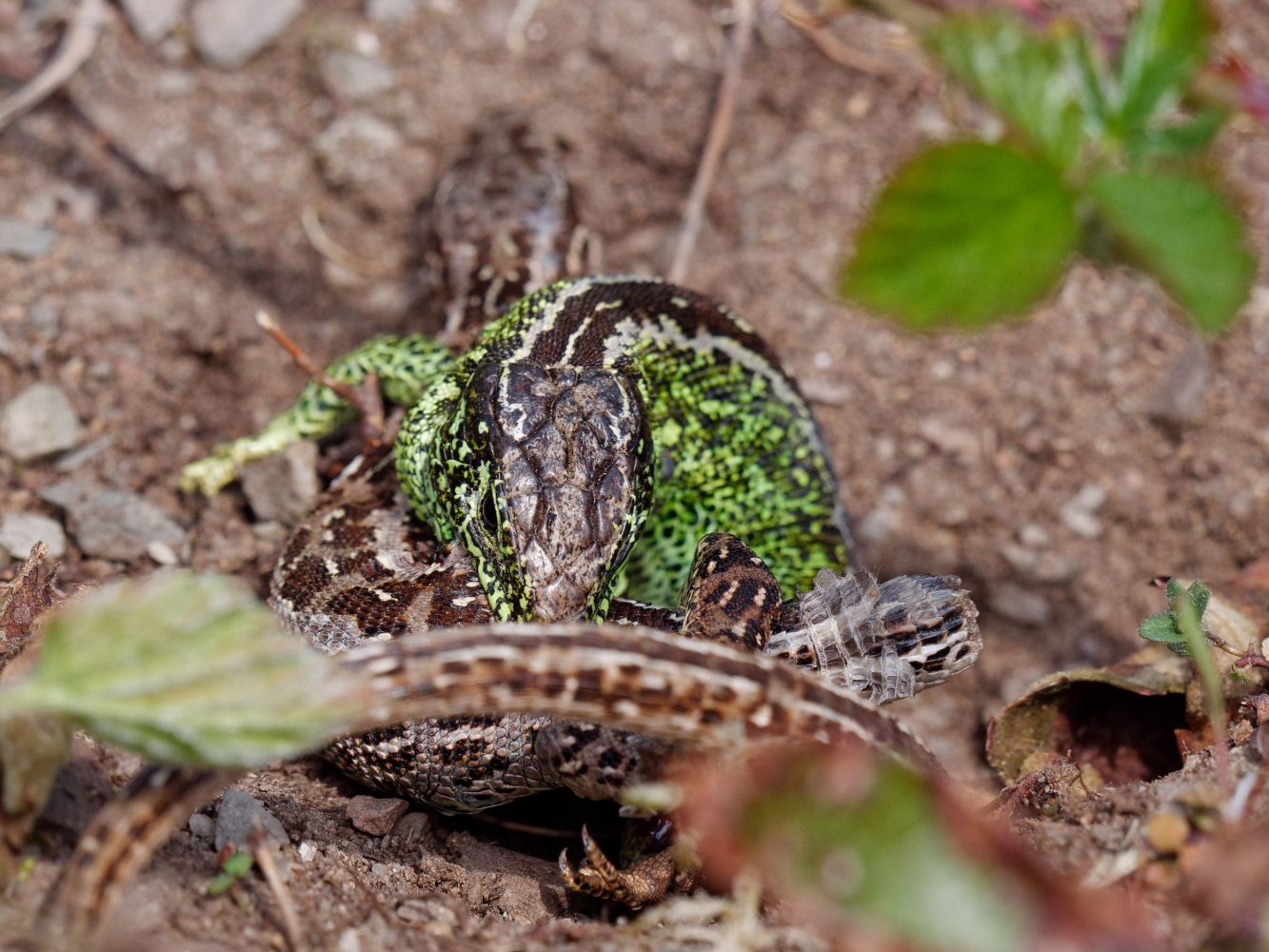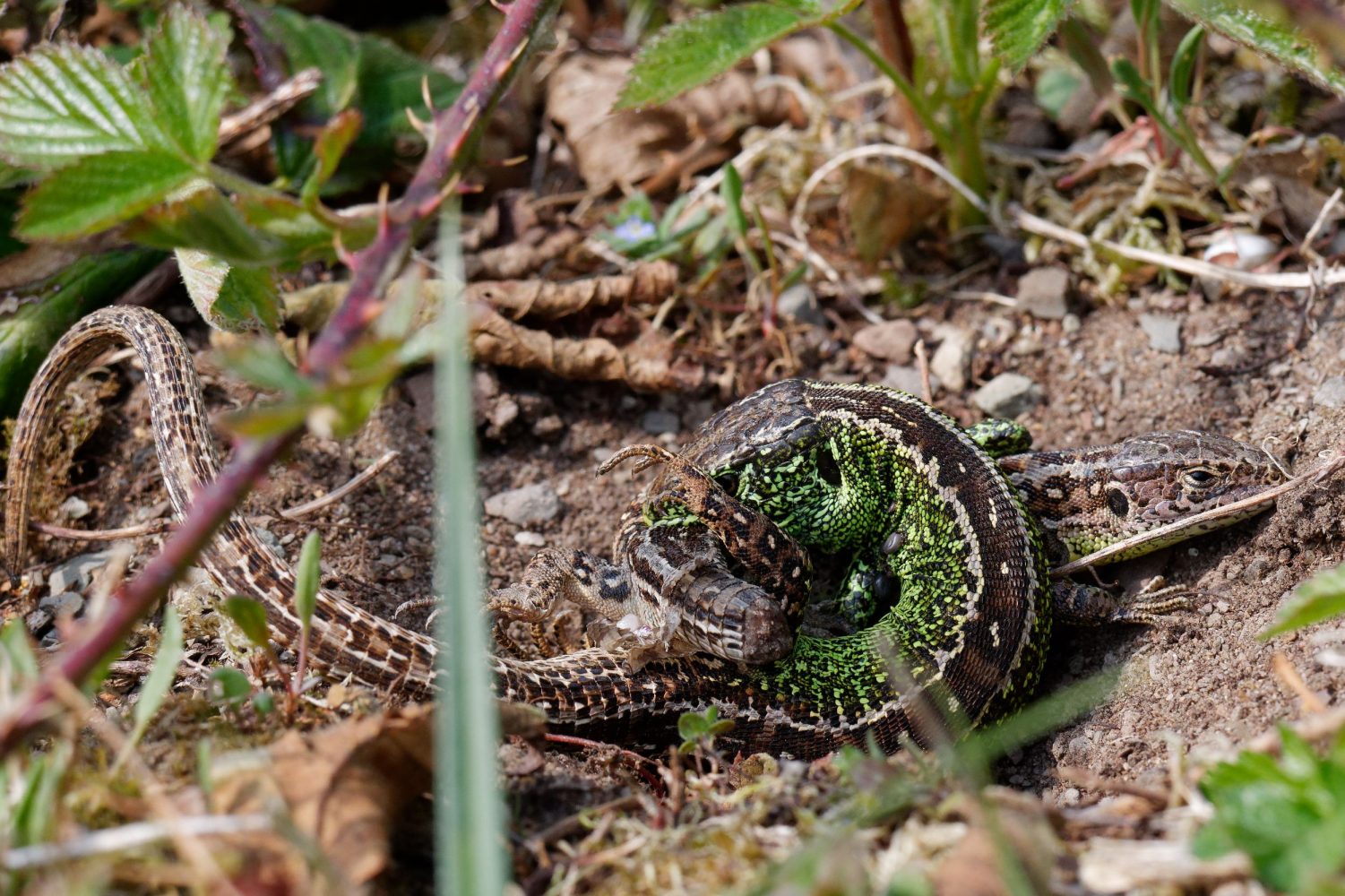 Bei der Paarung der Zauneidechsen (DBU Naturerbe, Kurve Dülmener Weg) geht es heftig zu. Das Weibchen hat bereits einen Teil des Schwanzes verloren.