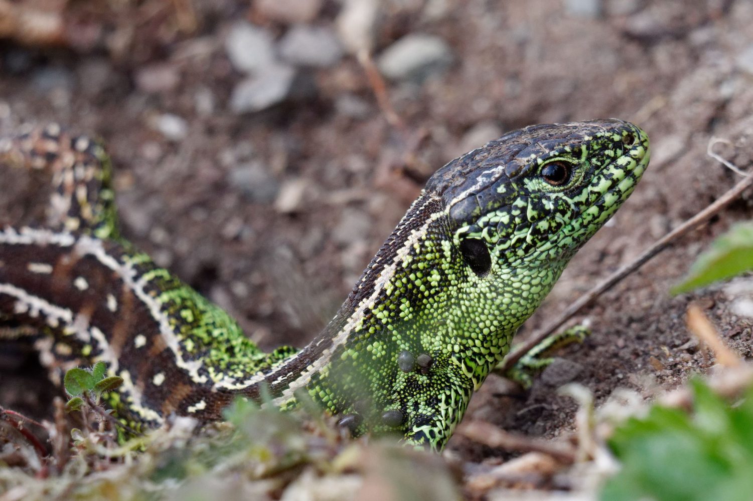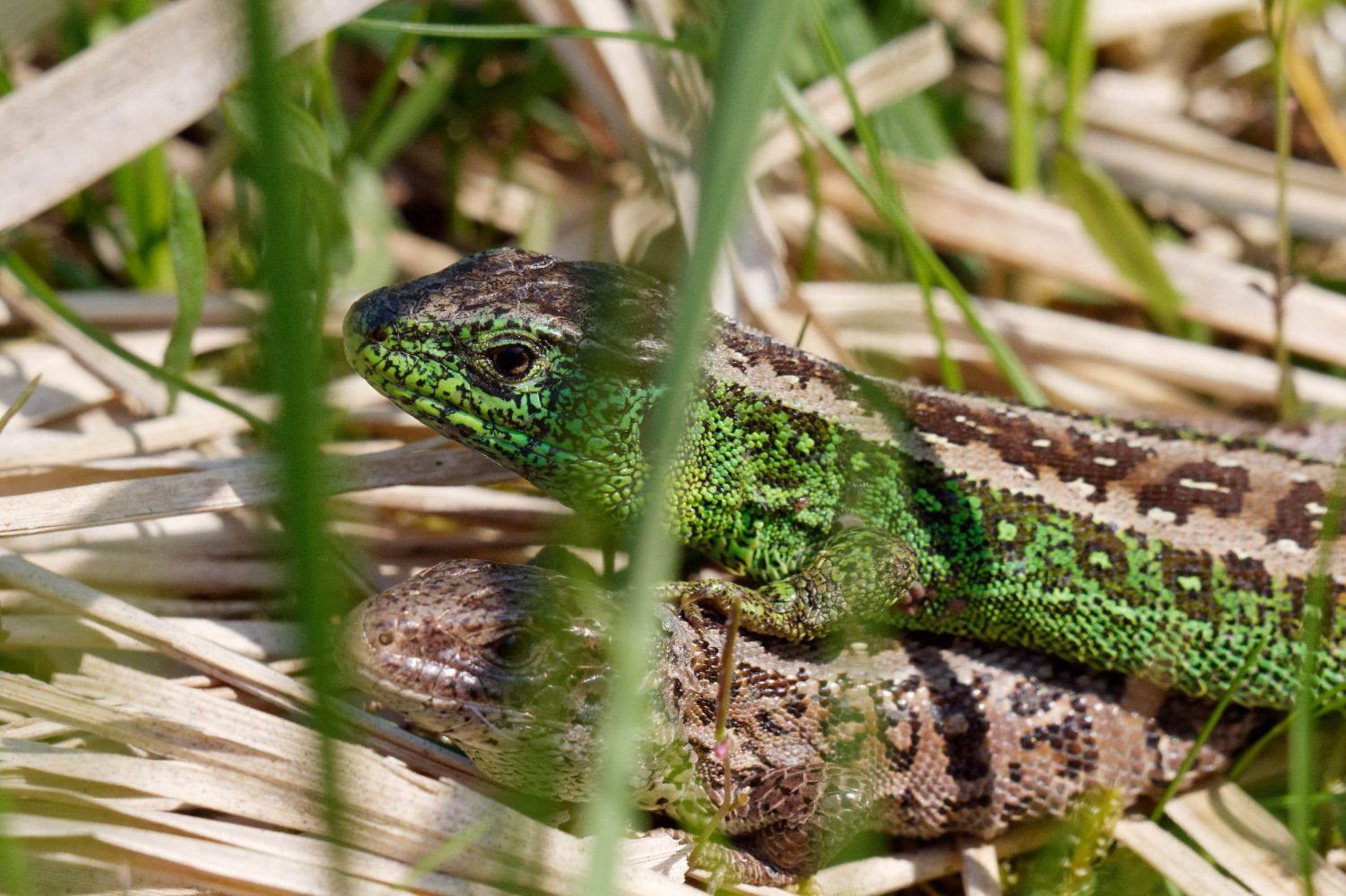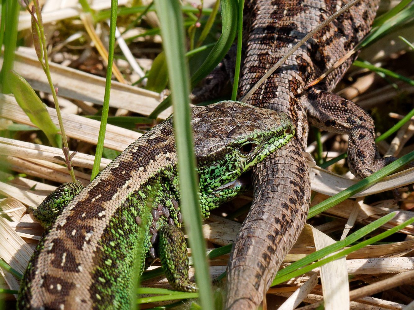 In der Paarungszeit der Zauneidechsen beißt das Männchen (grün) das Weibchen in die Flanken oder in den Schwanz. Außerdem zeigt das Männchen durch Aufliegen auf das Weibchen die Besitzansprüche an. (gestern, DBU Naturerbe Fliegerberg, Kurve Dülmener Weg)