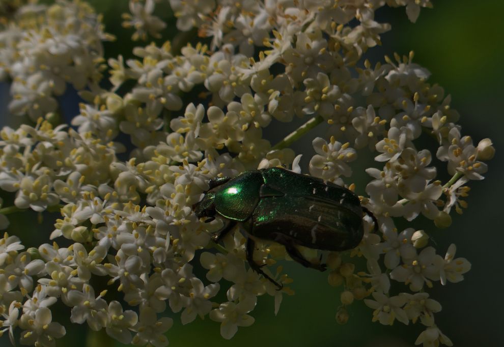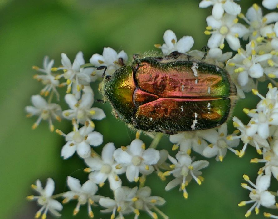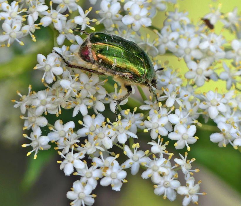 Gold- oder RosenkĂ€fer (Cetonia aurata) auf HolunderblĂŒten an der MaxstraĂe beim Tiergarten Raesfeld