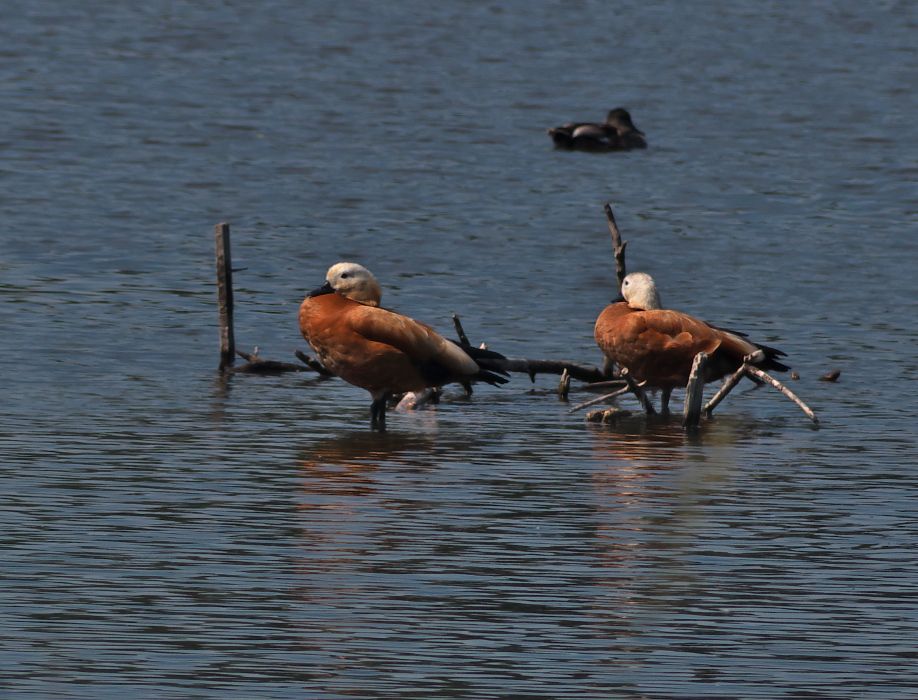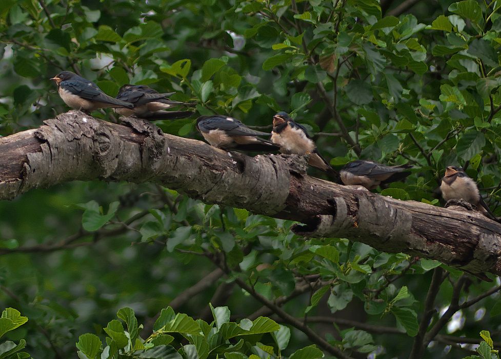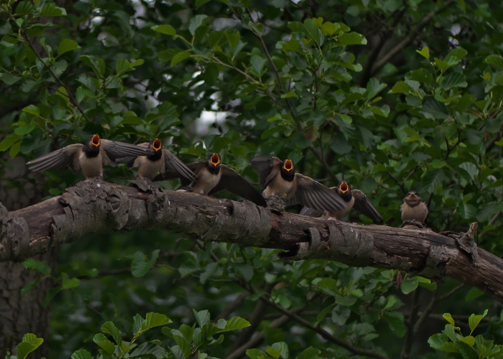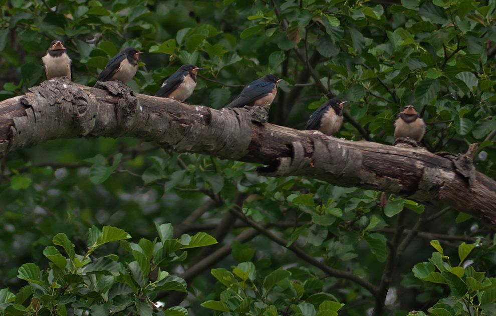 hungrige, junge Rauchschwalben in einem abgestorbenen Baum auf der Insel des Teiches hinter der Schlossklinik Prösting, fotografiert vom Ufer am Randes des Reitturnierplatzes. Auf der Wiese des Turnierplatzes jagten die Eltern nach Insekten, die anschlieĂend verfĂŒttert wurden.