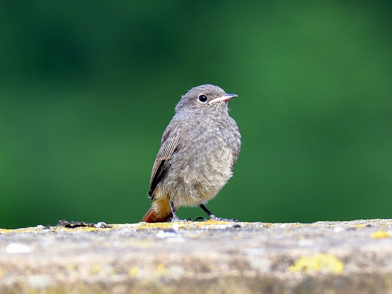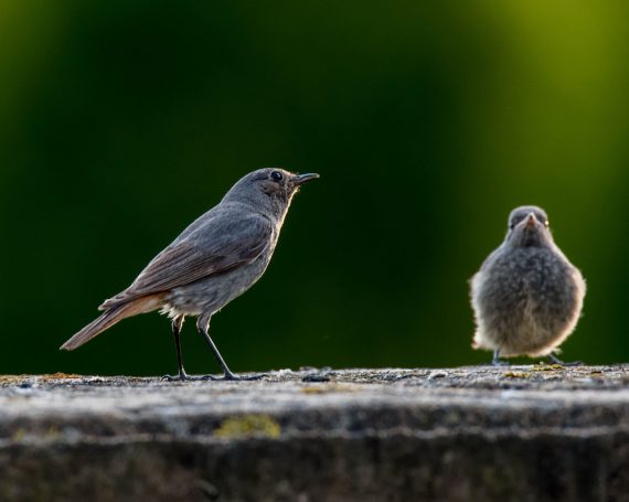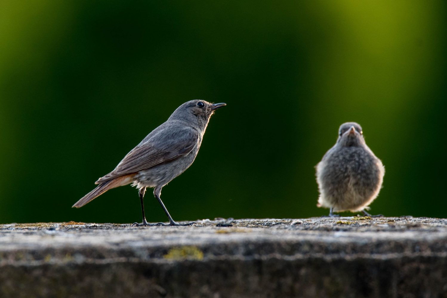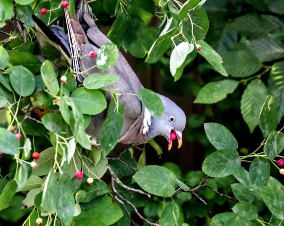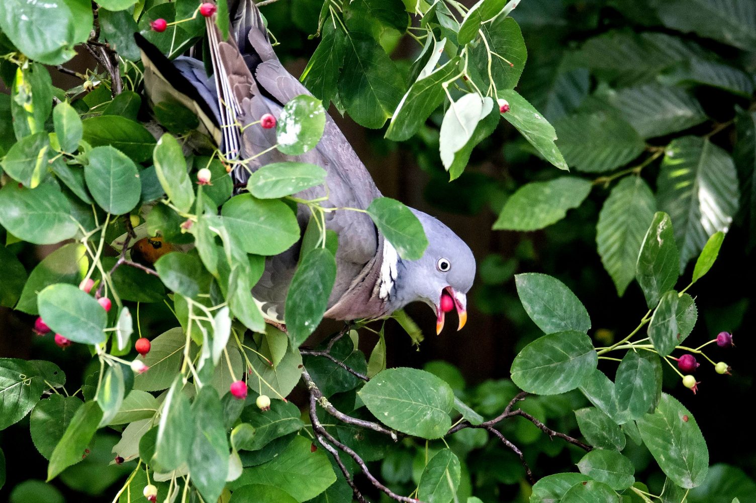 Im eigenen Garten, Gartenrotschwanz mit Nachwuchs und eine Ringeltaube, die sich an den FrĂŒchten der Felsenbirne satt frisst.