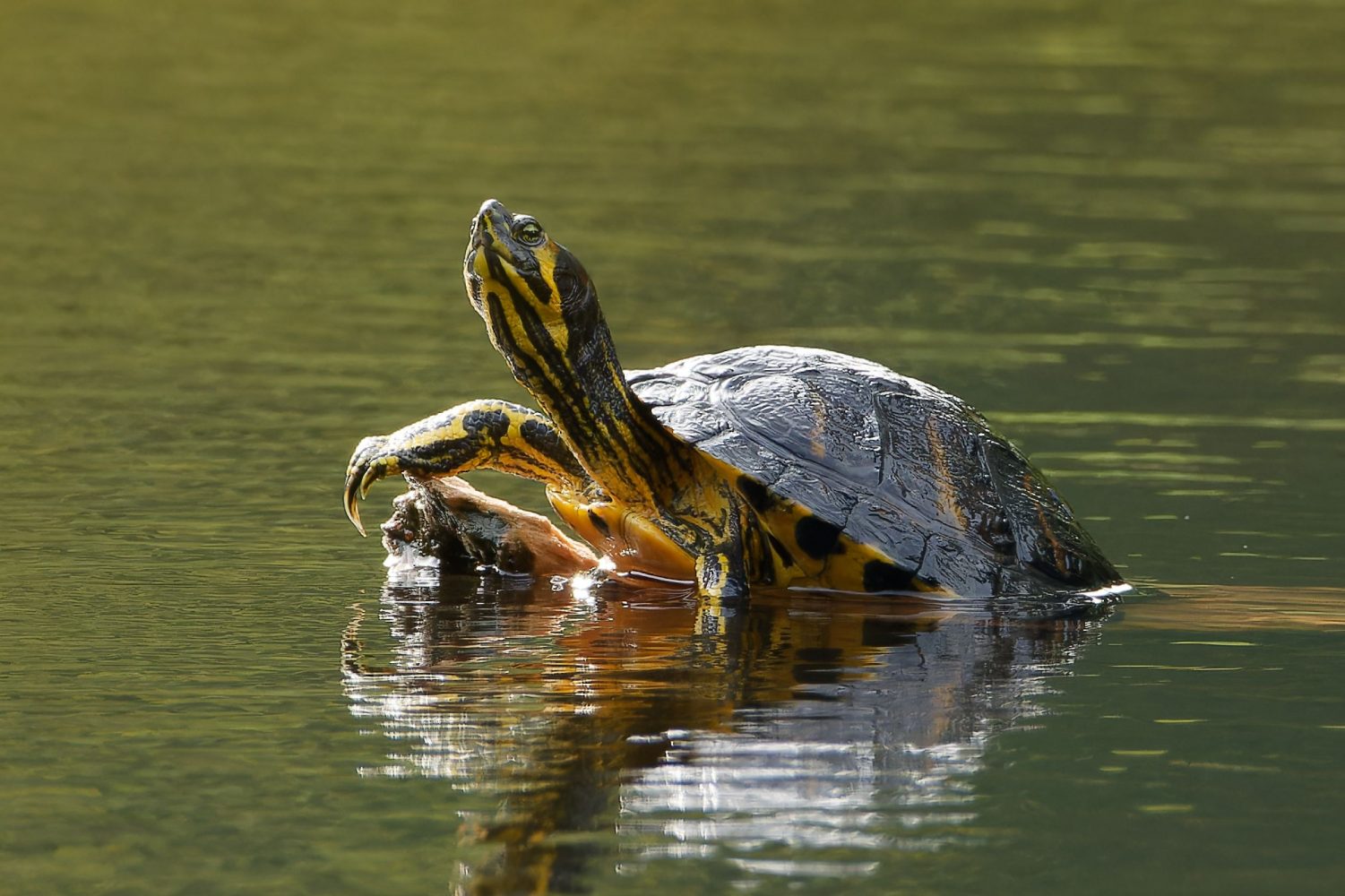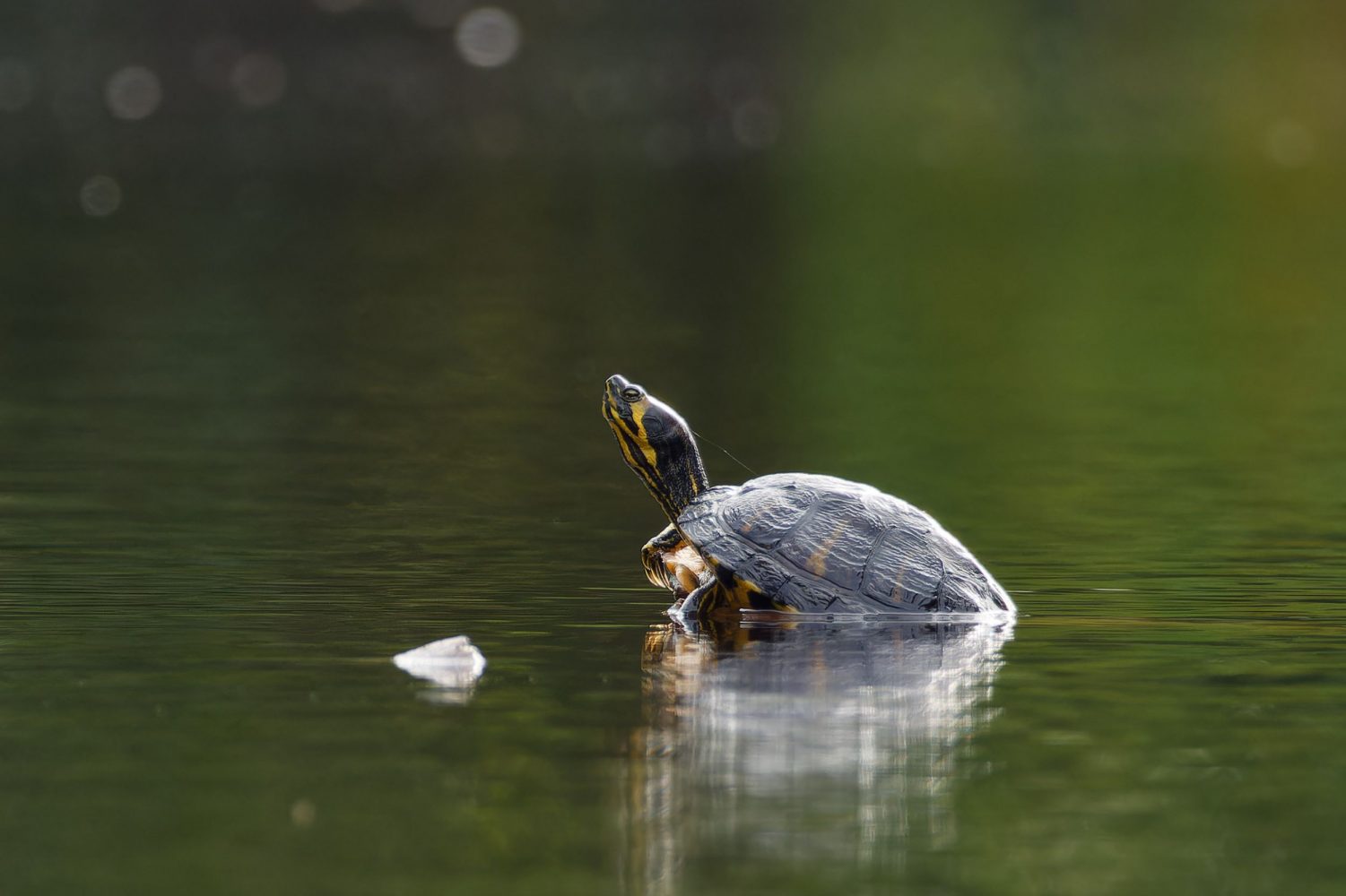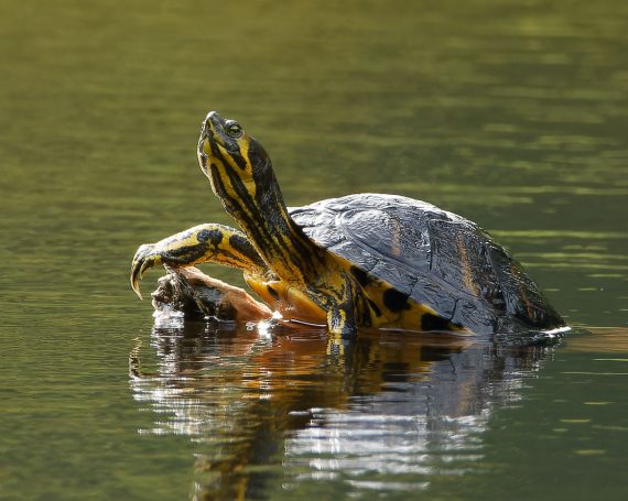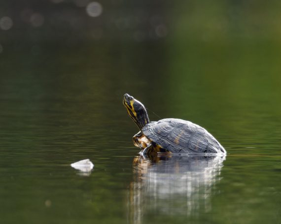 Die Gelbwangenschildkröte im Teich hinter dem Haus Pröbsting ist noch nicht im Winterschlaf sondern tankt noch in der Seemitte auf einem HolzstĂŒck die letzten Sonnenstrahlen.