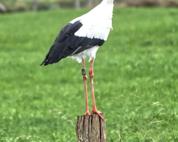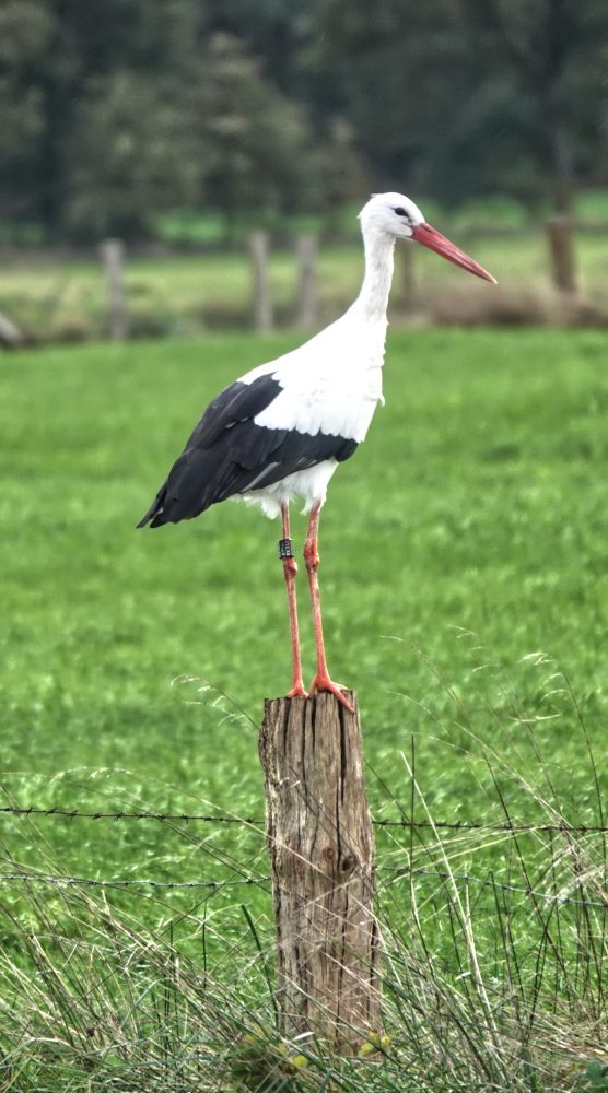 In der Dingdener Heide waren heute zwei WeiĂstörche. Einer stand in Pose auf einem Zaunpfahl.