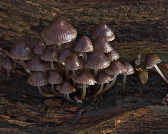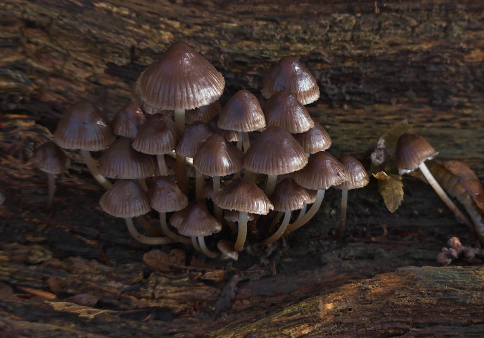 Winter-Helmlinge an liegendem Baumstamm, Parkplatz an Schlossklinik Pröbsting, 17.11.23