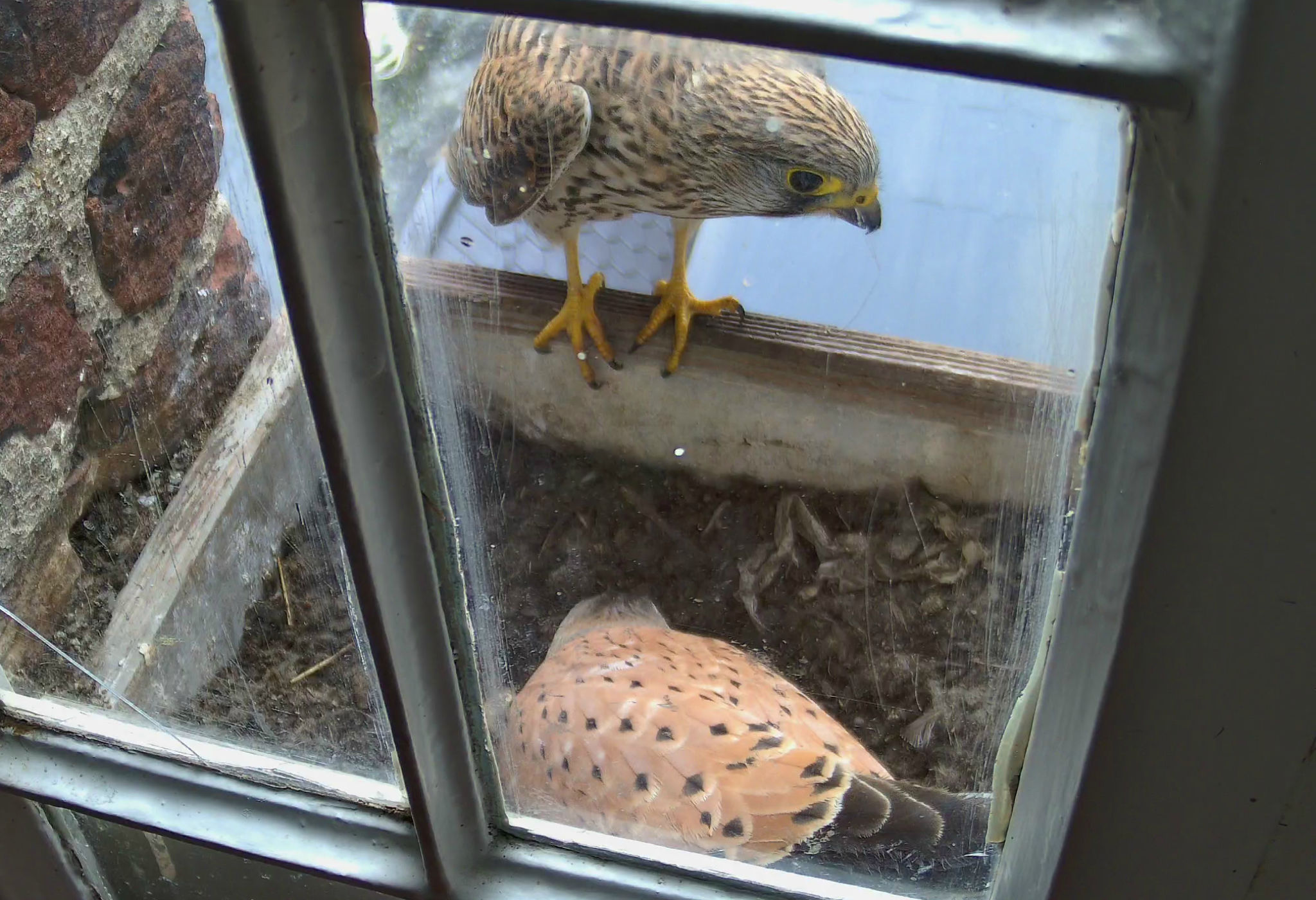 Das Falkenweibchen springt hüpft hoch zum Fensterrahmen - der Nachwuchs beobachtet dies aufmerksam.