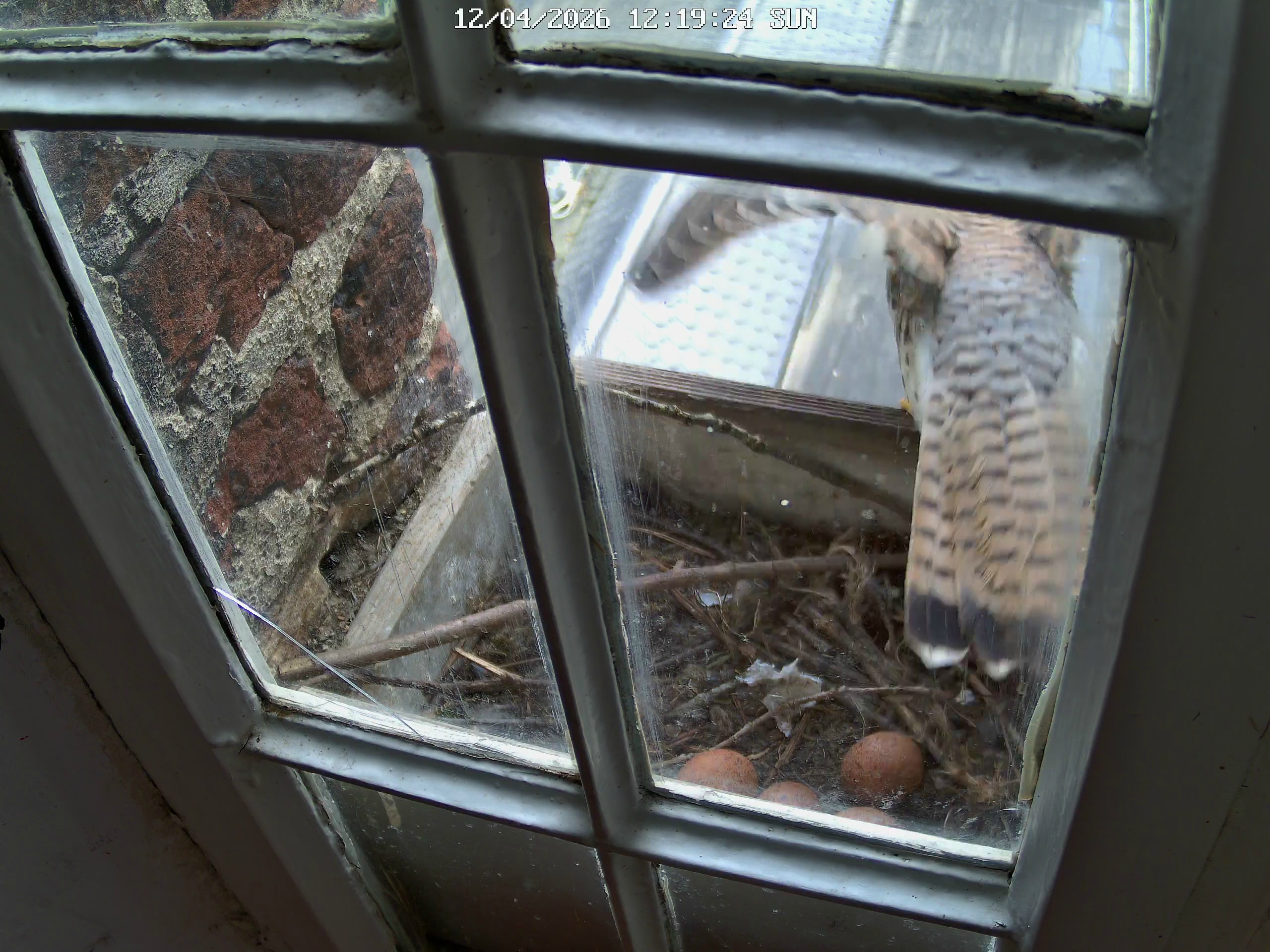 Es sind ab und zu zwei Eier gleichzeitig zu sehen, diese werden aber regelmäßig im Nest verschoben. Die Falken haben das Nest mit Papiertüchern ausgekleidet.